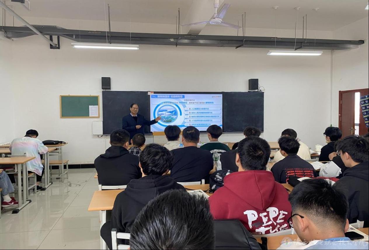 4月8日上午,陕西机电职业技术学院党委书记伊逊智在博学楼317教室为22智能联培1、22机械制造1合班学生上形势与政策课,讲授《读懂中国式现代化》专题内容。