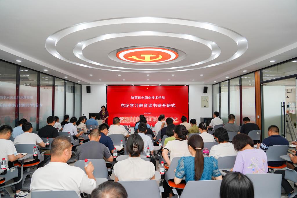 党委委员、宣传部部长李明宣读《中共陕西机电职业技术学院委员会关于举办党纪学习教育读书班的通知》(陕机电职院党发〔2024〕162号)及学校党委党纪学习教育读书班学习安排。